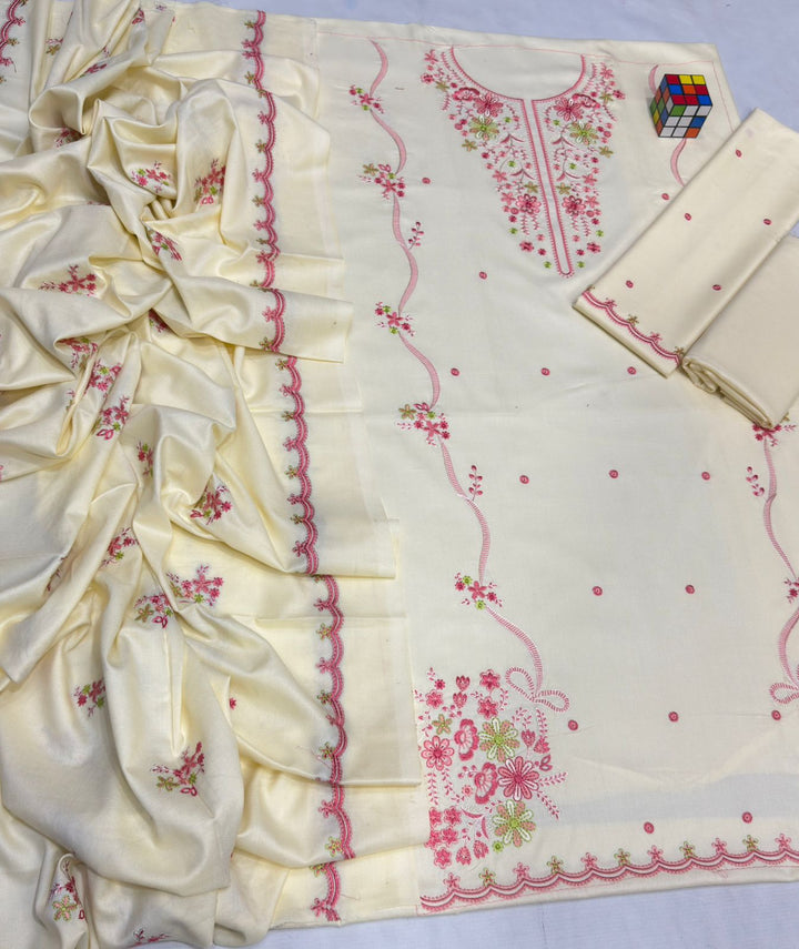 Step Into Seasonal Charm With This Unstitched Embroidered 3-Piece By MARIA B, Created To Offer A Perfect Balance Of Comfort And Contemporary Style. The Premium Heavy Embroidered Dhanak Shirt Features A Vibrant That Radiates Freshness And Elegance. A Coordinated Ready To Wear Heavy Embroidered Shawl Adds Graceful Flow, While The Dyed Dhanak Trouser Ensures Durability And Comfort. Ideal For Daywear, Casual Events, Or Festive Gatherings, This Ensemble Gives You The Freedom To Stitch A Look That Reflects Your Personal Fashion Sense.